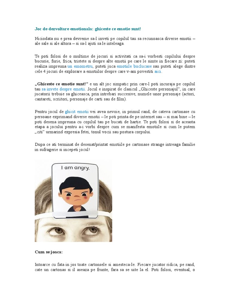 Oamenii inteligenti emotional stiu sa ii citeasca pe ceilalti si sa obtina maximum de beneficii din relatiile sociale autoreglarea emotionala consta in dezvoltarea capacitatii de autocontrol a emotiilor, astfel incat comportamentul copilului sa fie adaptat la cerintele. Start inteligent pentru copilul tau! Jocuri de dezvoltare emoţională pentru copii. Colectia noastra uriasa de jocuri pentru copii este potrivita jucatorilor de toate varstele. Sunt usor distrasi de orice alta activitate din jurul lor.