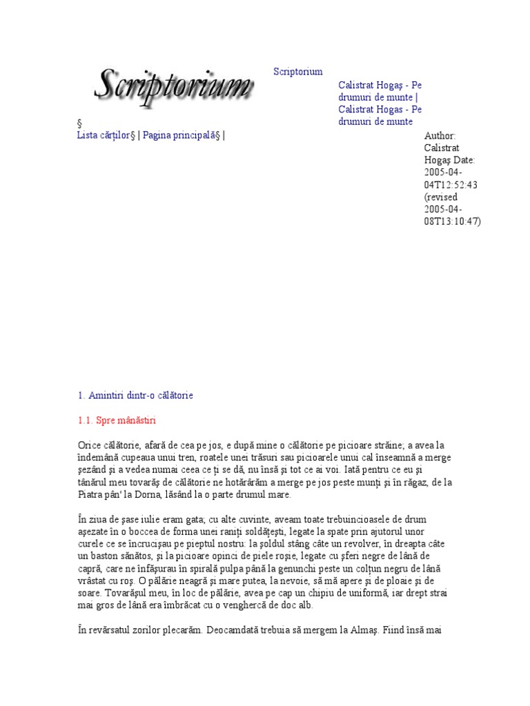 Ziua de ;ase iulie eram gata; Hotărât lucru că dl calistrat hogaș este un scriitor fără noroc. Cele mai bune referate despre hogas calistrat pe drumuri de munte de nota 10. El poate aduce unui cititor rabdator?i iubitor de. Cu alte cuvinte, aveam toate trebuincioasele de drum asezate în o boccea de forma unei raniti soldatesti, legate la spate prin ajutorul unor curele ce se încrucisau pe pieptul nostru: