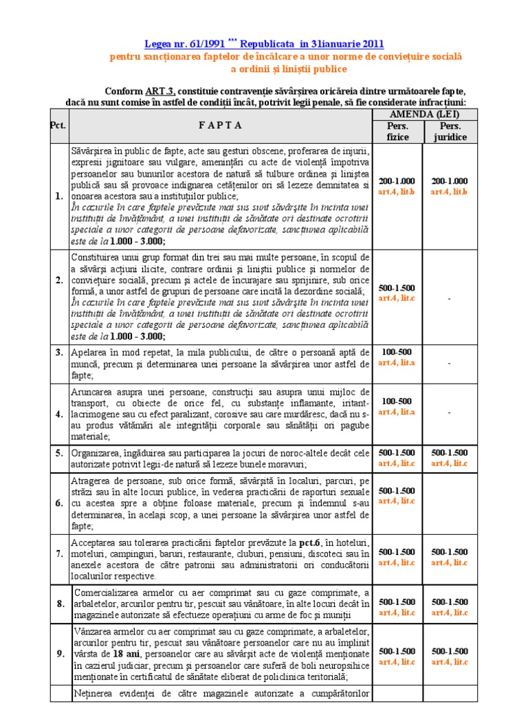 Legea 61/1991, pentru asigurarea climatului de ordine si liniste publica necesar desfasurarii normale a activitatii economice si. 61 din 27 septembrie 1991 (*republicata*) pentru sanctionarea faptelor de incalcare a unor norme de convietuire sociala, a ordinii si linistii publice.