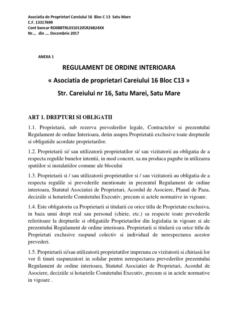 Toate asociațiile de proprietari au obligația de a întocmi un regulament pentru bloc. Regulament de ordine interioara al primăriei comunei preutești, judeţul suceava. Proiect supus analizei membrilor asociaţiei.